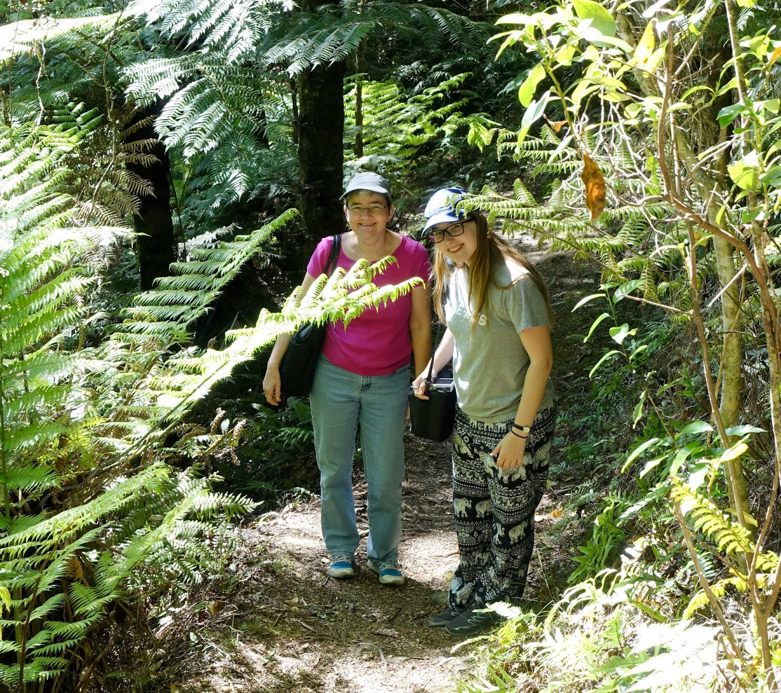 | Gudrun and Cora on a short hike amid native vegetation in the Pelorus River Valley |